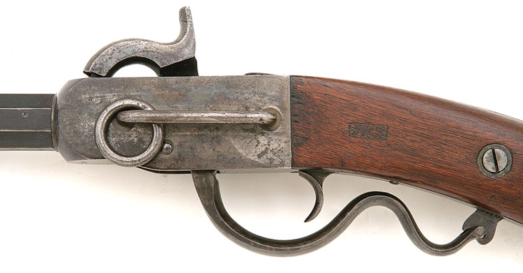 serial #2510, .52 cal. percussion, 20" barrel with an about excellent bright bore which shows only very sparse, very light pitting. The barrel is pleasing mix of original fading deep gray blue and smooth plum patina with some minor handling marks. The frame is primarily a mottled smoky case-hardened gray and flaky silver case-hardened and plum brown patina with fading original colors which are strong behind the hammer, lever and on the left side in the area of the sling ring bar. The lockplate is primarily a flaked pewter case-hardened patina with plum speckling while the hammer exhibits light pitting and remnants of original colors; the lever is now primarily a deep plum brown with silvery flaked case-hardening. The stock rates excellent with good original varnish, crisp left side cartouche and "R.K.W." inspectors marking ahead of the buttplate tang. The barrel, frame, lever, catch and breechblock numbers all match. There are numerous inspectors markings with a "PT" on the bottom of the barrel and a very light ".A. & Co." marking on the right diagonal barrel flat. The lock mechanism is crisp and mechanically functional. A very fine to excellent example overall of these rather prolific Union carbines. (34859-1) {ANTIQUE}
